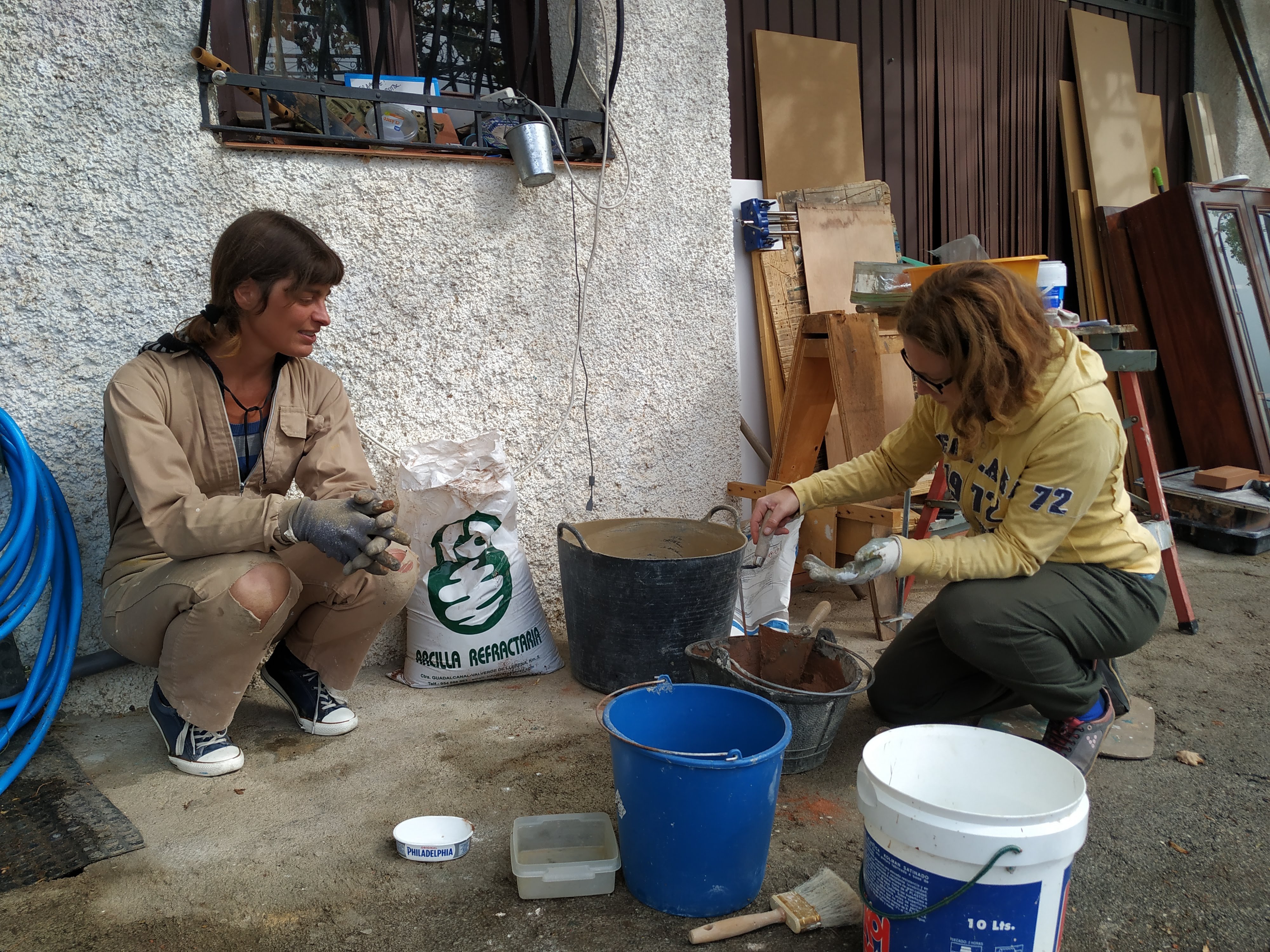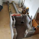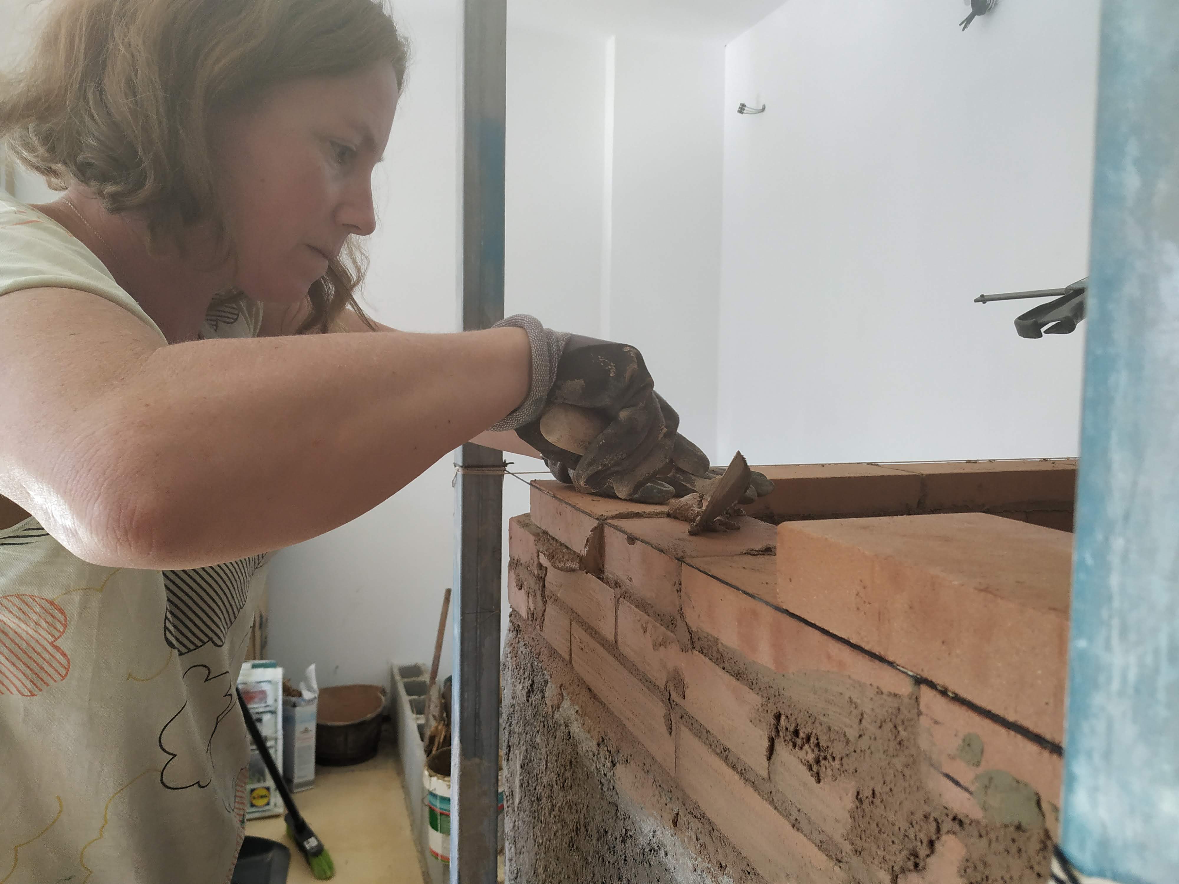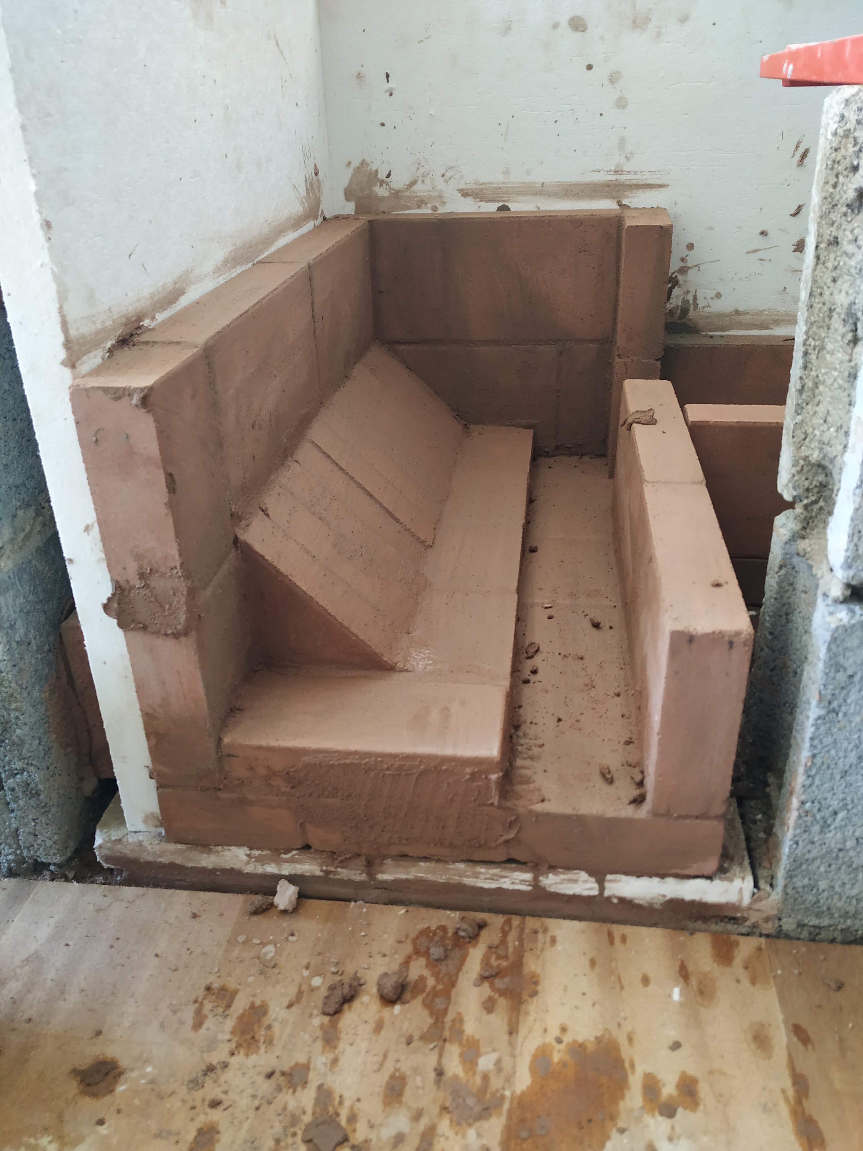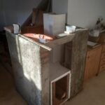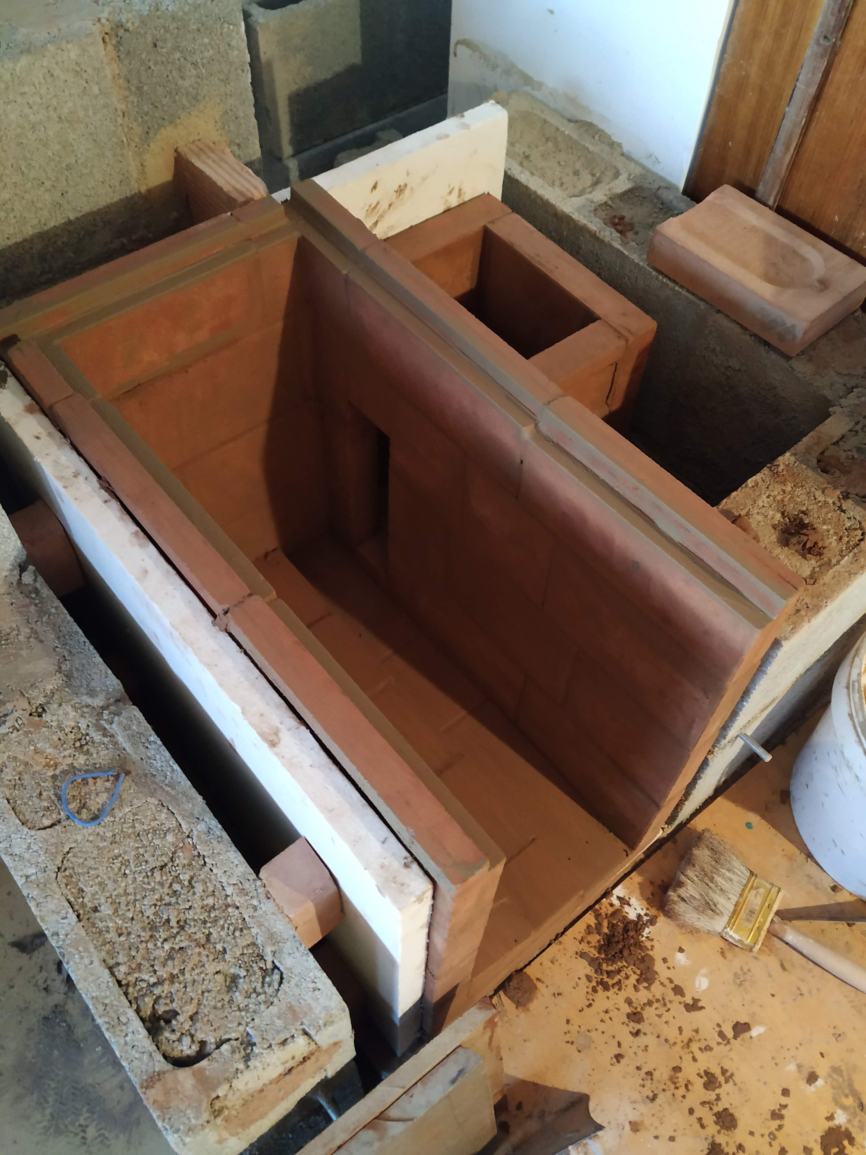 Then I built the lower part of block, got a German friend who had made her masonry heater of similar stuff to show us how to make and use clay mortar and built the core!…The rise is brick low down and then fibreboard only from the top of the firebox up.