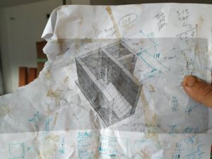 After looking at many designs and playing with j-tubes and hollow concrete blocks outside, I settled on building a batchbox, following as closely as I could the design on Peter van der Berg’s website: http://batchrocket.eu. This is a highly developed open-source design and on it’s accompanying website, the grand master of rocket mass heaters offers free downloads of Sketchup models of all his designs. I was also greatly helped by the kind souls on the forums of permies and donkey, where technical answers and hand-holding through the process are graciously offered.